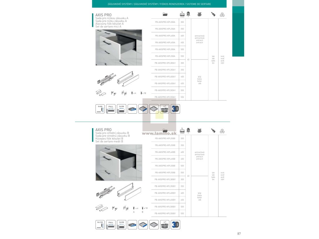 Výsuv Axis Pro má vysokú odolnosť certifikovanú na 60 000 cyklov. Poskytuje plnovýsuv v dĺžkach od 250 do 600 mm a mechanizmus tichého dovierania zaručuje tichý chod a jemné dovieranie výsuvu (zásuvky). 5 výškových variantov dokonale zapadne do vašej kuchyne a bočnica zásuvky so šírkou len 14 mm umožňuje maximálne využitie vnútorného priestoru nábytku. Záťaž na výsuv (zásuvku) umožňuje umiestniť do nej až 40 kg rôznych produktov. Inštalácia je jednoduchá vďaka pohodlnému nastaveniu na vnútornej strane, nastaveniu sklonu a horizontálnemu nastaveniu v rozsahu +- 2 mm. Výsuv je vhodný pre celý rad systémov na organizáciu priestoru, príborových vložiek, podložiek a triedičov odpadu.
