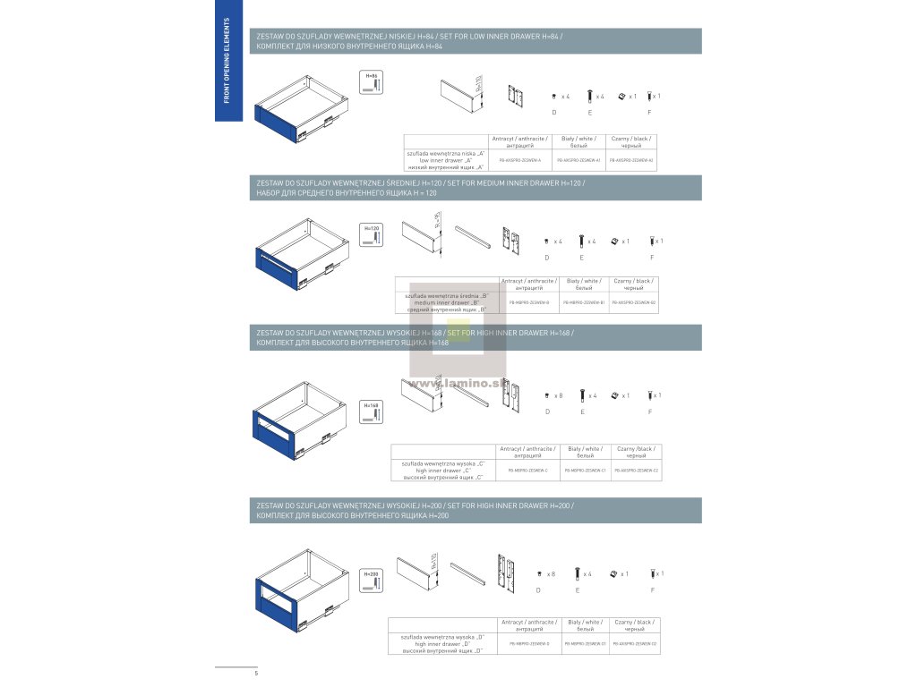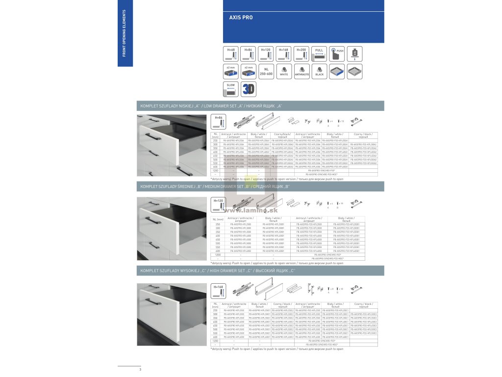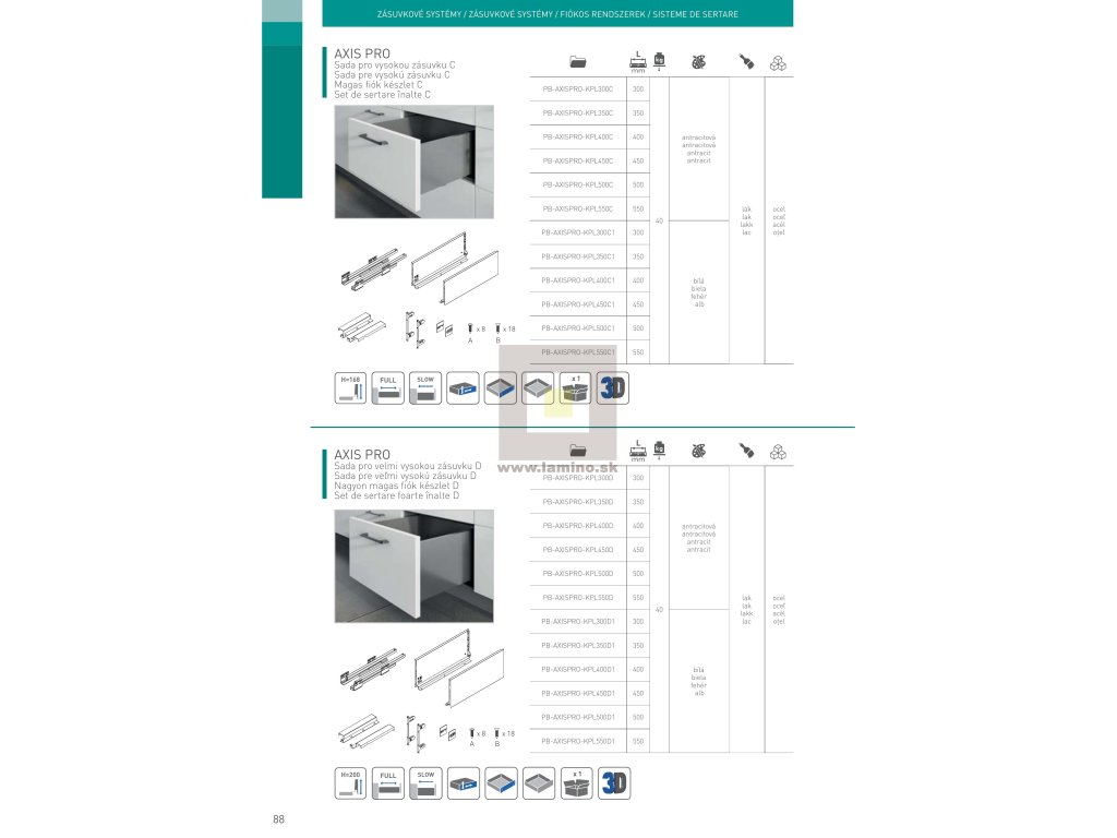 Výsuv Axis Pro má vysokú odolnosť certifikovanú na 60 000 cyklov. Poskytuje plnovýsuv v dĺžkach od 250 do 600 mm a mechanizmus tichého dovierania zaručuje tichý chod a jemné dovieranie výsuvu (zásuvky). 5 výškových variantov dokonale zapadne do vašej kuchyne a bočnica zásuvky so šírkou len 14 mm umožňuje maximálne využitie vnútorného priestoru nábytku. Záťaž na výsuv (zásuvku) umožňuje umiestniť do nej až 40 kg rôznych produktov. Inštalácia je jednoduchá vďaka pohodlnému nastaveniu na vnútornej strane, nastaveniu sklonu a horizontálnemu nastaveniu v rozsahu +- 2 mm. Výsuv je vhodný pre celý rad systémov na organizáciu priestoru, príborových vložiek, podložiek a triedičov odpadu.