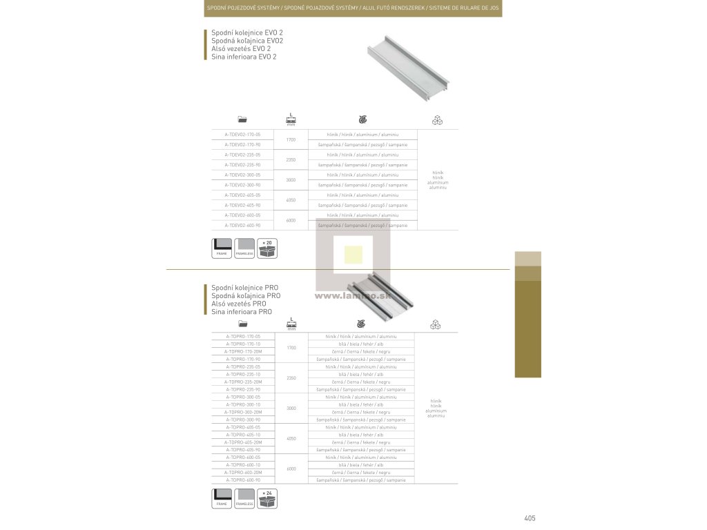 Jednou z najdôležitejších častí posuvných systémov je dolná koľaj PRO. Jej princíp inštalácie je pomerne jednoduchý. Koľaj dolná PRO udržiava dvierka skrinky v rovinách. Spoločným znakom tohto typu sú dve vodiace koľaje, na ktorých sú založené kolieska. Tvar týchto koľají sú prispôsobené ploche kolieska. Pred inštaláciou koľaje PRO by sa mal nainštalovať spodný polohovač - brzda.