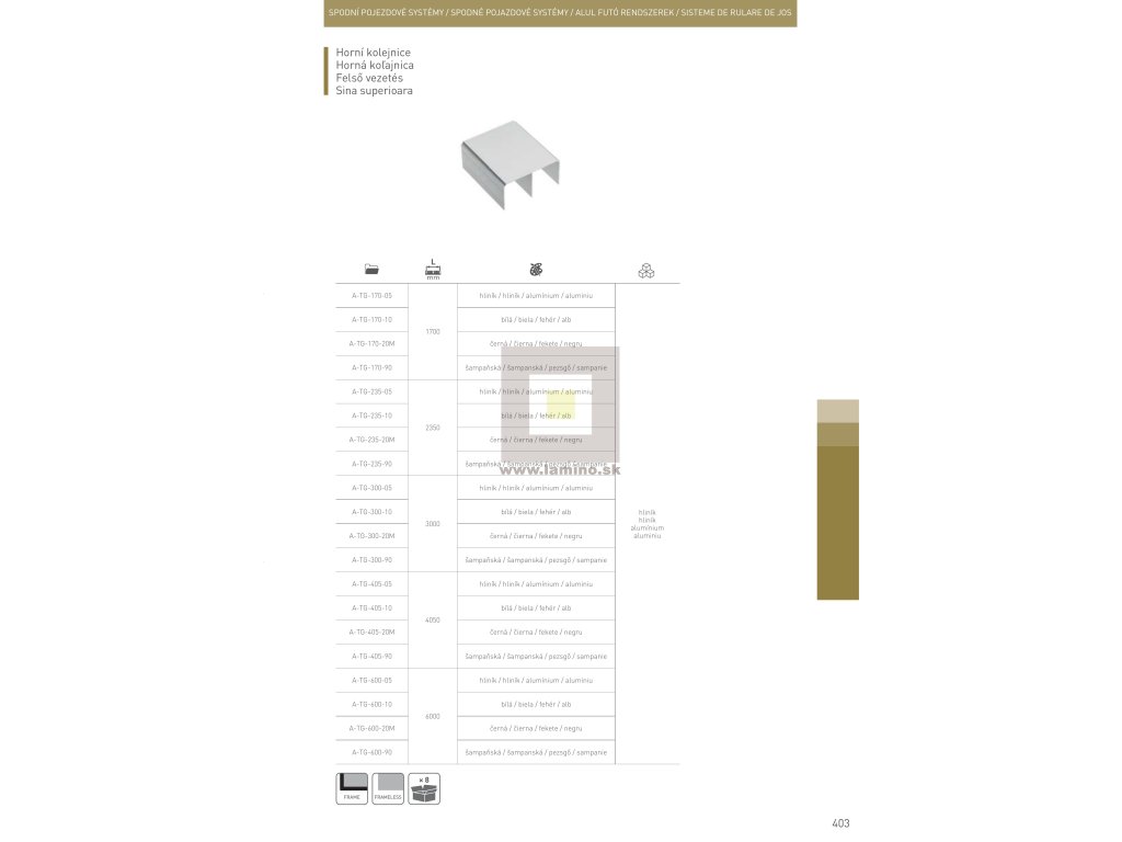 Horná koľajnica pre posuvné systémy je určená na udržanie roviny dverí vo horizontálnej polohe. Dôležitou výhodou je jednoduchá inštalácia hornej koľajnice. Horná koľajnica je univerzálna pre všetky posuvné systémy. Dostupné v piatich veľkostiach a štyroch farbách. Vďaka symetrickému usporiadaniu je možné hornú koľaj namontovať obojstranne. Špeciálna drážka vo vnútri koľajnice uľahčuje montáž skrutiek. Pred inštaláciou hornej koľajnice by sa mala skontrolovať kolmosť a rovinatosť stropu. Pri nerovnostiach stropu odporúčame použiť tieniacu škárováciu hmotu – silikon.