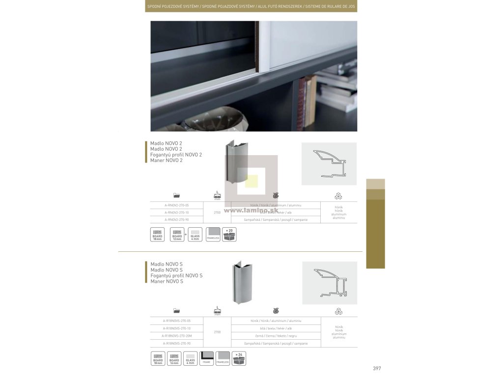 Madlo NOVO S je používané pri výrobe posuvných dverí, vstavaných skríň a šatníkov. Profil NOVO S (madlo) je možné použiť na viacero hrúbok materiálov 4 mm, 16 mm ale aj 18 mm vďaka čomu je možné použiť ako výplň sklo, drevotriesku alebo kombináciu skla nalepeného na drevotrieske. Madlo NOVO S vás záujme moderným a elegantným tvarom madla.