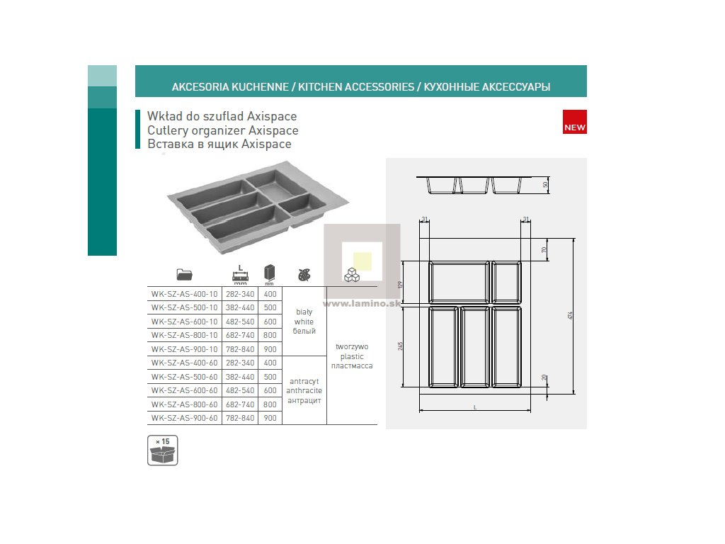 Príborník do zásuvky Axispace je vyrobený s kvalitného plastu, umožňuje spracovať interiéry kuchynských zásuviek. Príborník je veľmi priestranný a praktický, umožňuje vám mať všetko na dosah ruky, čo je mimoriadne dôležité pre každého človeka, ktorý sa venuje vareniu. V ponuke máme príborníky v rôznych veľkostiach (340-840 mm).
