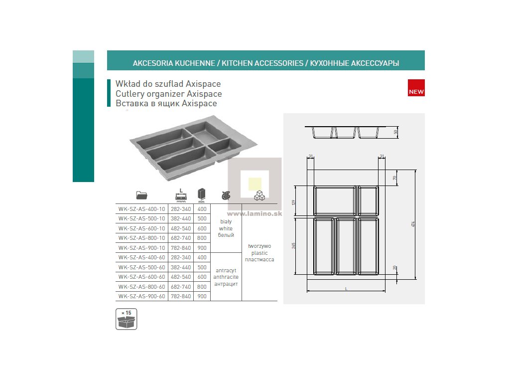 Príborník do zásuvky Axispace je vyrobený s kvalitného plastu, umožňuje spracovať interiéry kuchynských zásuviek. Príborník je veľmi priestranný a praktický, umožňuje vám mať všetko na dosah ruky, čo je mimoriadne dôležité pre každého človeka, ktorý sa venuje vareniu. V ponuke máme príborníky v rôznych veľkostiach (340-840 mm).