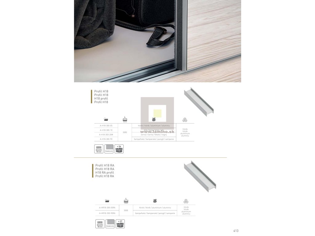 Profil H18 slúži na výrobu rôznych dekorov výplní v rámci jedného krídla dverí. Profil H18 je určený pre dosku s hrúbkou 18 mm. Dostupné v štyroch farebných variantoch.
